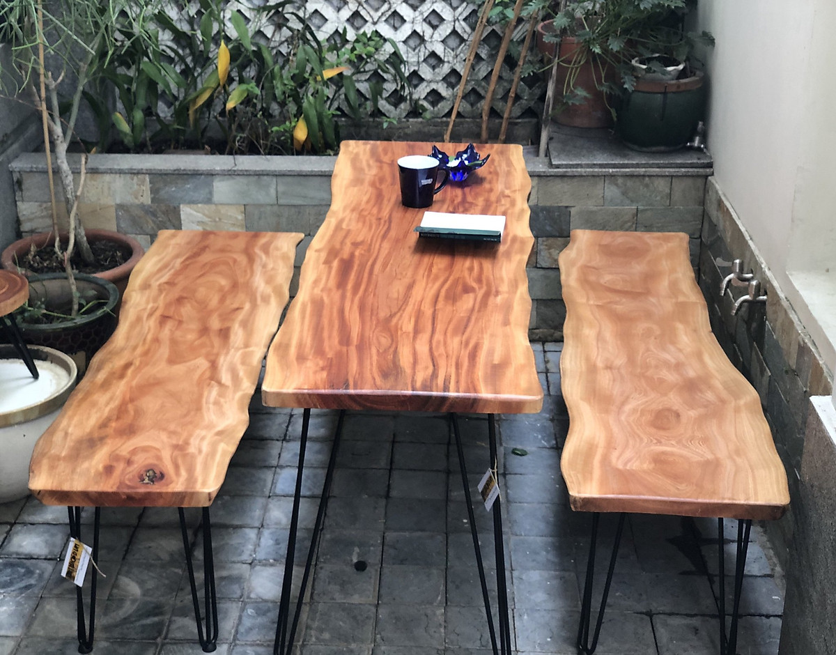 Bàn ghế mặt gỗ xà cừ nguyên tấm 1m6 chân sắt B-Ppm