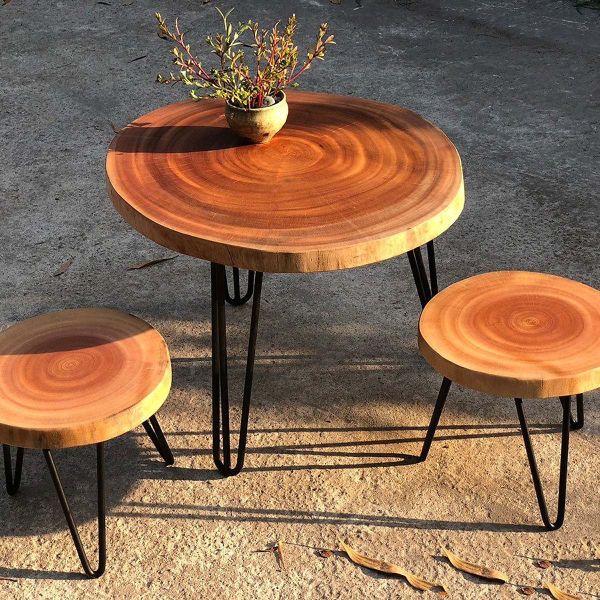Bộ bàn trà, bàn ghế cà phê gỗ xà cừ tự nhiên nguyên tấm, không gian quán, sân thượng, sân vườn, ban công
